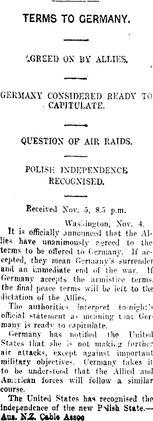 TERMS TO GERMANY. '.GREED ON BY ALLIES. GERMANY CONSIDERED READY TO CAPITULATE. QUESTION OF AIR RAIDS. POLISH INDEPENDENCE RECOGNISED. Keceived Nov. 5, 8.5 p.m. Washington, Nov. 4. It is officially announced that the Allies have unanimously agreed to the terms to be offered to Germany. If accepted, they mean Germany's surrender and an immediate end of the war. If Germany accepts the armistice terms. the final peace terms will he left to the dictation of the Allies. Tho authorities in(erp>-et to-nigli'.'s official statement as meaning t.iat Germany is ready to capitulate. Germany has notified the United States that she is not makh.g further air attacks, except against, important military objectives. Germany takes it to be understood that the Allied and American forces will follow a similar course. The United States has recognised the independence of the new Polish State.— Aus. IsZ. Cable Amm