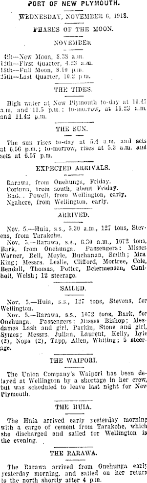 f>ORT OF NEW PLYMOUTH. WEDNESDAY, NOVEMBER 0, 1918. I'HASES OP THE MOON. NOVEMBER 4tli—New Moon, S.3S a.m. 12th—First Ijuarter, 4.2:{ a.m. 18th— Full Moon, 8.1(1 p.m. 25th—Last quarter, 10.2 p in. THE TIDES. High water at Nov Plymouth to-day at 10.47 a.m. and 11.5 p.m.; to-iuo.row, at 11.23 a.m. and 11.42 p.:u. THE SUN. The sun rises to-day at ii.4 a.m. and Bets at 0.5 C p.m.; to-morrow, rises at 5.3 a.m. and seta at 6.57 p.m. EXPECTED AIUiIVALS. Uarawa. from Onehunga, Friday. Corinna, from smith, about Friday. Badi . Powell, from Wellington, early. Xgahere, from Wellington, early. ARRIVED. Xov. s—Hula, s.s., 5.31) a.m., 127 tons, Stevens, from Tarakohe. Nov. r>— Rarawa, s.s., 11.30 a.m., 1072 tons, Bark, from Onehunga. Passengers: Misses Warner, Bell, Moyle, Buchanan, Smith; Mrs. King; Messrs. Leslie, Clifford, Mortree, Cole, Bendall, Thomas, Potter, Beleruiensen, Canlboll, Welsh; 12 steerauo. SAILED. Nor. s.—Hula, s.s., 127 tons, Stevens, for Wellington. Nov. s.—Rarawa, s.s., 1072 tons, Bark, for Onehunga. Passengers: Misses Bishop; ileadames Lash and girl. Parkin, Stone and girl, Symes; Messrs. Julian, Laurent, Kelly, Lylc (2), Nops ("), Tapp, Allen, Whiting; 5 steerage. THE WAIPOBI. The Union Company's Waipori has been delaved at Wellington by a shortage In her crew, hut was seheduled to leave last night for New Plymouth. THE 11UIA. The HUla arrived early yesterday morninf with a cargo of cement from Tarakohe, which she discharged and sailed for Wellington lo the evening. , THE RARAWA. The Rarawa arrived from Onehunga early yesterday morning, and sailed on her return lo the north shortly after 4 p.m.