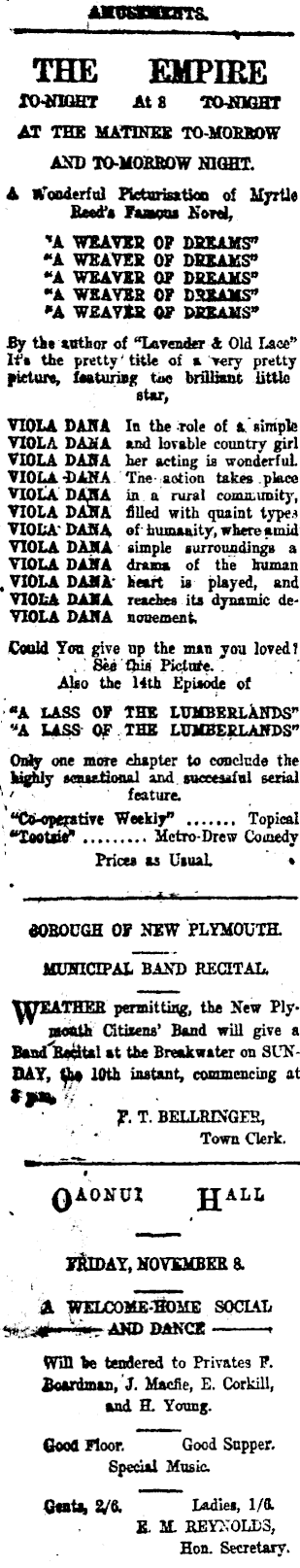 THE EMPIRE Kwnaar mb tojoght AT THE MATINEE TO-MORROW AND TO-MORROW NKfflT. A sVoßoerful PSctarisjttioo of Myrtle lUtfi Famous Ke«L <A WEAVER OP DBRAMS" "A WEAVER OF DHRAMS» •A WEAVER OF D3RAVS" "A WRAVRB OF DREAMS" By the author of "Lavender 4 Old Lace" Irs the pretty' title of a Tery pretty picture, teturug toe brilliant little star, VIOLA DANA In the role of a," simple VIOLA DAHA and lovable country girl VIOLA DAHA her acting is wonderful VIOLA-DAHA The-action takes place VIOLA DAHA in a rural community, VIOLA DAHA filled with quaint type.* VIOLA'DAHA of humanity, where amid VIOLA DAHA' simple surroundings a VIOLA DAHA drama of the human , VIOLA DAHA- heart is played, and VIOLA DAHA reaches its dynamic deVIOLA DAHA nouement. Could Yon give up the man jou loved? . ', See fjtui Picture. . Alio the 14th Episode of "A LASS OF THE LUXBERLANDS" "A LASS OF THE LTJXBESLAHDS" Oaty one more chapter to conclude the highly sensational and. cuesessful serial ' ' feature. itiv* Weekly" Topical Prices u Usual * eOBOCGH OF NEW PLYMOUTH. MOTICIPAL BAND RECITAL. trrEATHEB permitting, the New Plymouth CStiMiu' Band will give a Bnnd'Beiital at the Breakwater on SUNDAY, Of 10th instant, commencing at •Tin*} -v P. T. BELLRINGEE, ' " Town Clerk. QAONUI JJALL FRIDAY, NOVEMBER 8. A WELCOME-BOME SOCIAL *ste*h "<smi AMD DAKCE » Win he tendered to Privates F. fioardman, J. Macfie, E. Corkill, and H. Young. Good Floor. Good Supper. Special Music. Cat), 2/6. Ladies, 1/1 K. M. REYNOLDS, Hon. Secretary.