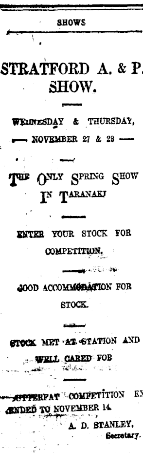 STRATFORD A. & P. SHOW. WSumoSDAY & THURSDAY, UOVBMBER 27 & 28 • IpBP ASI»Y CPRKG CHOW TS IJARANAKJ EKTEK TOUR STOCK FOR OOMPETITWS, dOOD K(XmE&B&IQK FOR OIOCK MET"**«6TATIOK AXD >3 -fIRLt. CABED FOB AT ' COMPETITIOS E? dtNDED "JO NOVEMBER li. A, D. STANLEY. Bwseury.