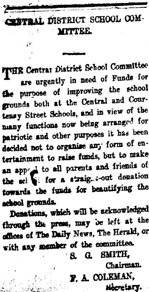 tSSWL #BTBICT SCHOOL COM--ICTTBE. WHS Central strict Wool Commute* 1 are nrgenUy in Beed of Fonda f« fbe purpose of imp™* l * tte ed " >ol ground.'both tt the Central and Coortenay Street School., and in view of the tutor fraction, now being for patriotic «nd other purposes it hw been decided not to organife any form of entertainment to raiae teds, but to make „ wU to afl J««nt» and friends of the «el%i for a a*aig-*-<wt donation toward, the fmd» far beautifying fie Mtool gmmda. Oraoch *& P»«' m J be left at the office* of The Daily News, The HeraM, or with tJV •«*» of the committee, a a smith, Chairman. j RA. COLEMAN,