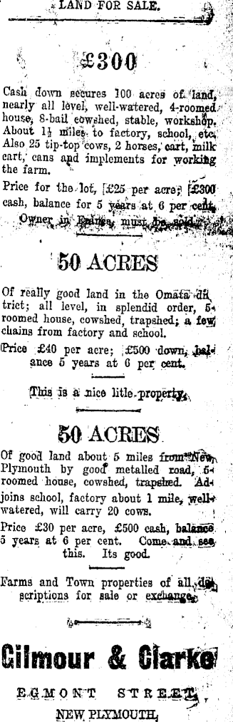 ~* LAND FOR SALE. Casli down Bc'eures 300 acres of.'land,' nearly all leve£ well-watered, 4-roomed" houses 8-baU'ec-wshed, stable, workshop. About 1J afilej. to factory, school, etet Also 25 tip-top ? cows, 2 horses,'cart, milk cart,' cans and implements for working the farm. Price for the,lof, [£2s per acre? fSSOff cash, balance for 5 yefcirsiat.C -penxbb soacres Of really good land in the Omata trict; all level, in Bplendid order, 5* roomed house, cowshed, trapshed;, a, fe«j chains from factory and school. IPrice £4O per acre; ;£SOO down*, ijwjk ance 5 years at 6 per cent. {Tina Is & .nice litle.jropjerjgk, 50 ACKiEB Of good land about 5 miles ixoufttifah Plymouth by goof metalled road, ,£« roomed house, cowshed, trapshed. Ad-i joins school, factory about 1 mile* jffeU* watered, will carry 20 cows. • i Price £3O per acre, £SOO cash, balance 5 years at 6 per cent. this. Its good. Farms and Town properties of all v smptions for sale or ' Gilmour & 6M E-S XO NT S"T E EJE. 'l' , pmrpisoiouTH,