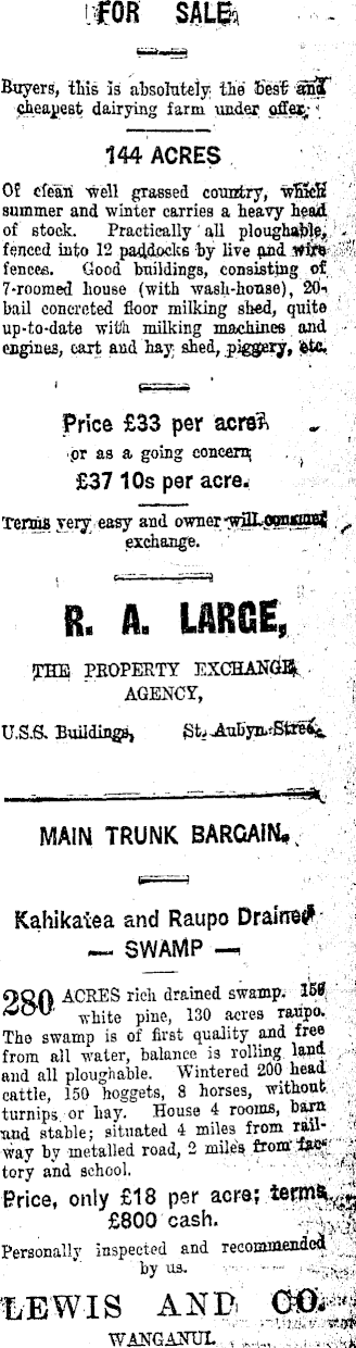 fOR SAL& Buyers, this is absolutely; the Besi&'W^ 1 ' cieauest dairying farm under offet; • 144 ACRES 0! rfeaii -well grassed country, wfficH summer and winter carries a heavy head of stock. Practically all ploughable, fenced into 12 paddocks by live pad i*ir* fences. Cood buildings, consisting of 7-roomed house (with wash-lurase), 20i bail concreted floor milking shed, quite up-to-date witla millimg machines and engines, cart and hay shed, piggery, etc. Price £33 per acreft pr as a going concern; . £37 10s per acre.. Terms yeryveasy and owner "m&Jxmgxßt exchange. JTHB PBOPERTY EXCHANGE ■ AGENCY, U.S.S. Buildingß, Sti^Aoljyn.«BtrlJ^. MAIN TRUNK BARGAIN,; Kahikaiea and Raupo Drained —. SWAMP 9QA ACRES rich drained swamp. 150 * aU ' white pine, 130 acres raupo. The swamp is of first quality and free from all water, balance is rolling land and all ploughable. Wintered 200 head cattle, 150 hoggets, 8 horses, without and stable; situated 4 miles from rail- ■ way by metalled road, 2 miles fronriae?: ,-, tory and school. f '' Price, only £lB per acre; £BOO cash. , ..,'/! Personally inspected and recommended ' by us. - ~ ,-. b 1/BWIS AND. .00*2 WANGA2TOL x