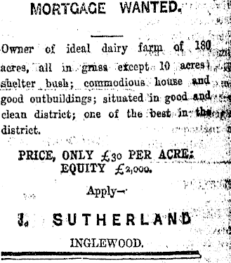 MORTGAGE WANTEDS ,^ Owner of ideal dairy faqi of 18Q awes, Tall in>/glass etcepfc 10 acre9}„.,gj stelter^bash; commodious house wi>>» good outbuildings; situated in good an.d<jf*j dean district; one of the toest in- tbjfrjp district. 'M': 4 PRICE, ONLY £3O PER ACRE; EQUITY £s,ooo. 3, SUTHERLAND INGLEWOOD. , ~