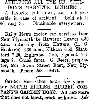 ATHLETES ALL USE DR. SHELDON'S MAGNETIC LINIMENT. A favorite rub down, and indispensable in case of accident. Sold at Is 6d and 3s. Obtainable everywhere. Daily News motor car services from New Plymouth to Hawera: Leaves 4.30 ftjn., returning from Hawera (L. 0. Hooker's) 6.30 a.m., Eltham 6.50, Stratford 7.20, Inglewood 7.50, Egmont Village 8. Coach fares. G. Beere, proprietor, 525 Devon Street East, New Plymouth. Phone 253—Advt. Garden Hose-that lasts for years—for NORTH BRITISH RUBBER COMPANY'S GARDEN HOSE. AH hardware that does not burst, crack.or.kw ,k - »4sk