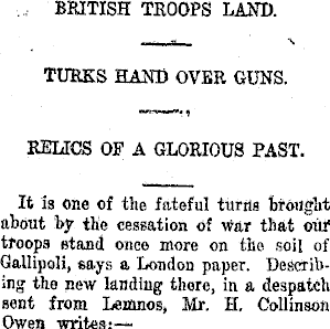 ... BRITISH TROOPS LAND. TUBES HAND OVER GUNS. RELICS OF A GLORIOUS PAST. It is one of the fateful turns brought about by the cessation of war that our troops stand once more on the soil of Gallipoli, says a Loudon paper. Describing the new landing there, in a despatch sent from Lemnos, Mr. H. Collinson Owen writes:—