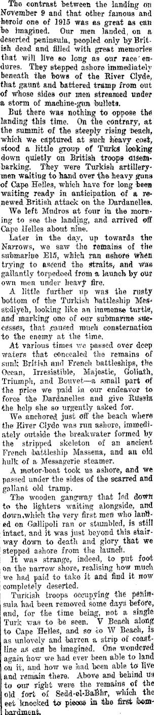 The contrast between the landing On November 9 and that other famous and heroin one of 1915 was as great as can he imagined. Our men landed, on a deserted peninsula, peopled only by British dead and filled with great memories that will live so long a 9 our race'endures. They stepped ashore immediately beneath the bows of the River Clyde, that gaunt and battered tramp from out of Whose Sides our men streamed under a storm of nradhine-gnn bullets. But there was nothing to oppose th«t landing this time. On the contrary, at the summit of the steeply rising 'beach, which We captured at such heavy cost, stood a little group of Turks looking down quietly on British troops disembarking. They were Turkish artillerymen Waiting to hand Over the heavy guns of Cape Hefies, which have for long been waiting ready in anticipation of a renewed British attack on the Dardanelles. We left Mttdros at four in the morning to see the landing, and arrived off Cape llelles about nine. i Later in the day, up towards the Narrows, we saw the refflairis of the submarine El 5, which fan ashore Whffitt j trying to ascend the Straits, and was j gallantly torpedoed frotit a launch by our ! own men under heavy lire. ! A little further up was the rusty [bottom of the Turkish battleship Megsudiyeh, looking like an immense turtle, I and marking on© of our submarine sueIcflsaes, that .caused much consternation Ito the enemy at the time. At various times we passed over deep waters that concealed the remains of sunk British and French battleships, the Ocean, Irresistible, Majestic, Goliath, Triumph, and Bouvet —a small part of the price we paid in our endeavor to force the Dardanelles and give Russia the help she so urgently asked for. We anchored just off the beach wlierfi the River Clyde was run ashore, immediately oirtiude the breakwater formed by the stripped skeleton of an ancient French battleship Massena, and au old hulk of a Messagerie steamer. A motor-boat took us ashore, and we passed under the sides of the scarred and gallant old tramp. The wooden gangway that fad dowti to the lighters waiting alongside, and down.which the very first meii who landed on Gallipoli ran or stumbled, is still intact, and it was just beyond this stairway down to death and glory that we stepped ashore from the launch. It was strange, indeed, to put foot on the narrow shore, realising how much we had paid to take it and find it now" completely deserted. Turkish troops occupying the peiuffsula had been removed some days before, and, for the time being, not a single Turk was to be seen. V Beafill along to Cape Belles, and so to W Beach, Is as unlovely and barren a strip of coastline a-f can be imagined. One wondered again how we had ever been able to land oil it, and how we had been able to* live and remain there. Above and behind US to out right were the remains of the old fort of Sedd-01-Baßhr, winch the eet knocked to pieoes in the first ibofflbardmcnt.