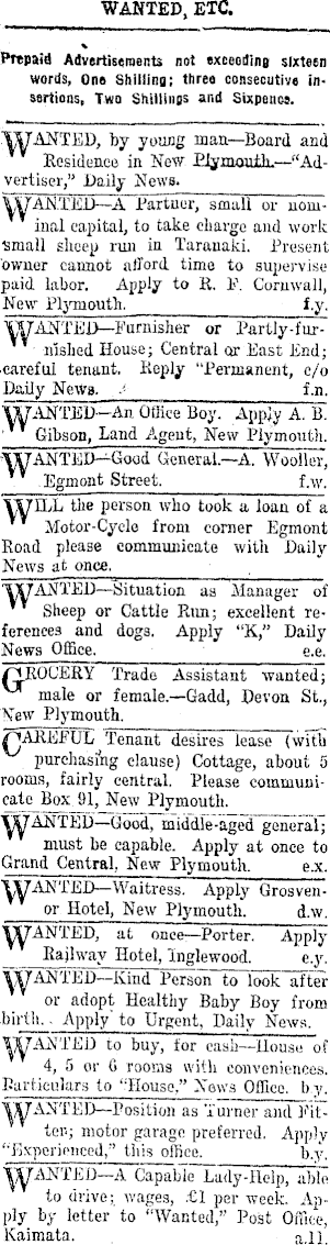 WANTED, ETC. Prepaid Advertisements not exceeding sixteen words, One Shilling; three consecutive insertions, Two Shillings and Sixpence. ANTED, by young mail—Board and Residence in New Plymouth.—"Advertiser," Daily News. ANTED —A Partner, small or nominal capital, to take charge and work small sheep run in Taranaki. Present owner cannot afford time to supervise paid labor. Apply to R. 1\ Cornwall, New Plymouth. f.y. WANTED—Furnisher or Partly-fur-nished House; Central or East End; careful tenant. Pieply "Permanent, c/o Daily Ne\Va. ■< f.n. f ANTED—An Office Boy. Apply A. B. Gibson, Land Agent, New Plymouth. 'WANTED-Good General.—A. Wooller, .Egmont Street. f.w. YUILL the person who took a loan of a Motor-Cycle from corner Egmont Road please communicate with Daily News at once. TS^ANTED —Situation as Manager of Sheep or Cattle Run; excellent references and dogs. Apply "K," Daily News Office. e.e. rjJ.ROCERY Trade Assistant wanted; male or female.—Gadd, Devon St., New Plymouth. /""JAREFUL Tenant desires lease (with purchasing clause) Cottage, about 5 rooms, fairly central. Please couimunicatc Box 91, New Plymouth. RANTED— Good, middle-aged general; must be capable. Apply at once to Grand Central, New Plymouth. e.x. ANTED—Waitress. Apply Grosvenor Hotel, New Plymouth. d.w. ■yyANTED, at oni'e-—Porter. Apply _ Railway Hotel, Inglewood. e.y. ANTED—Kind Person to look after or adopt Healthy Baby Boy from birth.. Apply' to Urgent, Daily News. ■RANTED to buy, for cash—House of 4, 5 or C rooms with conveniences. Particulars to '.•House," News Office, b.^ ANTED—Position as Turner and Fitter.; motor garage preferred. Apply ''Experienced," this office. b.y. ANTED—A Capable Lady-Help, able to drive; wages, £1 per week. Apply by letter to "Wanted," Post Office, Kaimata. a .ll.