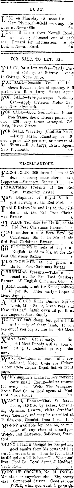 LOST. New Plyraoutli-AGold p"r-ring. Ileward at News Office. f.n. ear-marked; diamond out of each ear. Reward for information. Apply Luckin, Newall Road. f.n. FOB SALE, TO LET, Etc. r jPO LET, for a few weeks—Partly Furnished Cottage at Bltzroy. Apply to Cottage, News Office. jpOR- SALE —Seaside Tea and Luncheon Rooms; splendid opening. Full particulars—R. A. Large, Estate Agent. F°® SALE—Five-passenger Wolseley Car.—Apply Criterion Motor Garage, New Plymouth. d.x. SALE —Good Second-hand Piano; iron frame, check action; perfect order. £3O; easy terms arranged.—Collier's, Devon Street. pOR SALE, Waverley (Okotuku Road) —Dairy Farm, consisting of 104 acres; price £'2B per acre, or nearest offer. Terms.—R. A. Large, Estate Agent, New Plymouth. a.x. MISCELLANEOUS. jpRESH EGGS—2OO dozen in lots of 30' dozen or more; make offer on rail, Lepperton.—Sampson, Sentry Hill. f CHRISTMAS Presents at the Red Post. Inspection invited. x "W"EW Shipment of "Royal Doultoi'., just arriving at the Red Post. x. rpABLE Knives IBs aiid 15s fid thi halfdozen, at the Red Post Christmas Bazaar. ' x Ol PIECE Tea Sets for 21s 6d. at the Red Post Christmas Bazaar. x Q.IVE mother a nice Fern Bow' for Christmas; 10s 6d to 30s at the Red Post Christmas Bazaar. x it PATTERNS in sets of Jugs; all English; 8s 6d to. 20s, at the Ret Post Christmas Bazaar x JgLECTROPLATE at old prices at the Red Post Christmas Bazaar. (TJHRISTMAS Presents.—Take a look round at the Red Post Crockery Bazaar. All English China and Glass x Lamb, Lamb for Xmas; reduced Id per lb. Order early.—lmperial Meat Supply. A DELICIOUS Xmas Dinner: Spring Lamb, Mint Sauee, Green Peas and New "Taties." Lamb down Id per lb at The Imperial Meat Supply. JJOULTRY isn't cheap, but get a little and plenty of cheap lamb. It will eke out if you buy at The Imperial Meat Supply. VMAS Lamb. Get in early. The 'lmperial Meat Supply will sell tons of lamb, owing to reduced prices; order now. RANTED —Those in search of a secondhand Motor Cycle see Eltham Motor Cycle Repair Depot list, on front page. H/fANY suppliers make factory working costs small. Result—better returns for every one. Write The Wanganui Fresh Food Co., or local agent (J. Mudford, Veale Road). bx RANTED, Known—That W. Saxon Jones, D.S.O.A. by axam., Consulting Optieian, Hawera, visits Stratford every Tuesday, and may be consulted at F. Edwards, Chemist, from 1 p.m. to P j\fONEY available for loan on, or purchase of, any class of security.— Wright and Laurence, Solicitors, Stratford. H/f ANY a farmer thought he was getting good results from his cows until he sent his cream to us. Then he found that he did quite a bit better. —The Wanganui Presli Food Co. Local Agent, J. Mudford, Veale Road. ». b.x. ■RING OP CROZTER, No. 91, INGLEMountain or anywhere else. Big, roomy cars. Competent drivers. Pood service WOOD, when jou wan'i Jo go