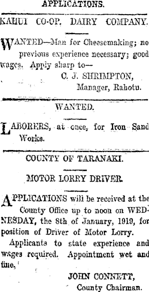 APPLICATIONS. KAHUI CO-OP. DAIRY COMPANY. Man for Ohessemaking; no previous experience necessary: good Wages, Apply sharp to— C.'d. SHUIMPTON, 1 Manager, Rabotu. WANTED. T ABOIiEBS, at cnce s lor Iron Sand Works. COUNTS OF TARANAKI. MOTOR LORRY DRIVER, will be received at the County Office up to aoon on WEDNESDAY, the Bth of January, 1919, for position of Driver of Motor Lorry. Applicants to state experience and wages required. Appointment wet and fine, 1 JOHN CONN3STT, County Chairman.