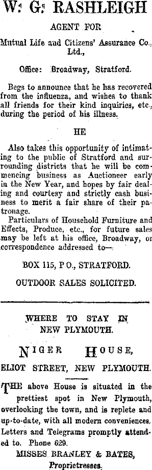 W; 6; RASHLEIGH AGENT FOR Mutual Life and Citizens' Assurance Co., Ltd., Office: Broadway, Stratford. Begs to announce that he has recovered from the influenza, and wishes to thank all friends for their kind inquiries, etc, during the period of his illness. HE Also takes this opportunity of intimating to the public of Stratford and surrounding districts that he will be commencing business as Auctioneer early in the New Year, and hopes by fair dealing and courtesy and strictly cash business to merit a fair share of their patronage. Particulars of Household Furniture and Effects, Produce, etc., for future sales may be left at his office, Broadway, or correspondence addressed to—; BOX 115, P 0., STRATFORD. OUTDOOR SALES SOLICITED. JVHERE TO STAY IN NEW PLYMOUTH. JJIGER |J 0 U S E, ELIOT STREET, NEW PLYMOUTH. rpHE above House is situated in the prettiest spot in New Plymouth, overlooking the town, and is replete and up-to-date, with all modern conveniences, Letters and Telegrams promptly attended to. Phone 629. MISSES BRANLEY & BATES, Proprietresses;
