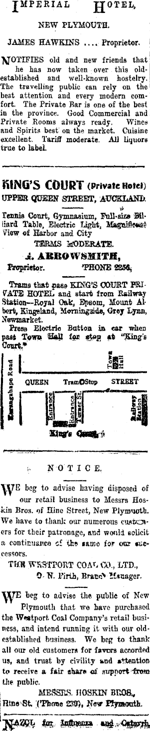 JMPERIAL JJOTEL, NEW PLYMOUTH. JAMES HAWKINS .... Proprietor. NOTIFIES old and new friends that he has now taken over this oldestablished and well-known hostelry. The travelling public can rely on the beat attention and every modern comfort The Private Bar is one of the best in the province. Good Commercial and Private Booms always ready. Wines and Spirits best on the market. Cuisine excellent. Tariff moderate. All liquors true to label KING'S COURT (Private Hotel) OH® QUEEN STREET, AUCKLAND. Tennis Court, Gymnasium, Fnll-aiEa 'Billiard Table, Electric light, MageifiwaSr 7iew of Harbor and City TERMS itfODERATE. J. ABBOWBMITH, Proprietor. »PHONE 228% Trams that pasa KING'S COURT PRIVATE HOTEL and atari from Railway Station—Royal Oak, Bpeom, Mount Albert, Kingsland, Morninguide, Grey Lynn, Newmarket. Press Eloctrfo Button in ear wfoeu past Town Sail igg stojj at "King's Court.* 11 te t4 " 1 1 & QUEEN TramOStep STREET 1| IJ I| ®UW« 4Mgr4 t. NOTICE. W E bog to advise having disposed of our retail business to Messrs Hoskin Bros, of nine Street, New Plymuotb. We have to tliank our numerous custoiers for their patronage, and would solicit a continuance c£ ih* same for okt «c* cessors. Ttfß WTiISrrOUT COAT, CO., LTD., 0' Tf. Firth, BratK v Itunager. WE beg to advise the puMie of New Plymouth that we have purchased the W«tport Coal Company's retail business, and intend running it with our oldestablished business. We beg to thank all our old customer* for favors accorded us, and trust by civility Mid attention to receive a fair share of support irosn the public. MESSRS. HOSKIN BKOft, Htne St. ("Phcme 2XO), Nev Hyawnth. JJASSgL |ps Spgrnm