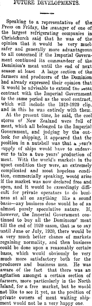 FUTURE DEVELOPMENTS. Speaking to a representative of the Press on Friday, the manager of one of the largest refrigerating companies in Christchurch said that he was of the opinion that it would be very much safer and generally more advantageous to all concerned if the Imperial Government continued its commandeer of the Dominion's meat until the end of next season at least A large section of the farmers and producers of the Dominion had already expressed their opinion that it would be advisable to extend t'tte weat contract with the Imperial Government to the same period as the wool contract, which will include the 1919-1920 clip, and in this he was entirely with them. At the present time, he said, the cool stores of New Zealand were full of meat, which all belonged to the Imperial Government, and judging by the outlook for shipping, it appeared that the position in a nutshell was that a, vear's supply of ships would have to endeavour to take a two years' production of meat. With the world's markets in the upset condition they were, an extremely complicated and most hopeless condition, commercially speaking, would arise if the market was now declared free and open, and it would be exceedingly difficult for private operators to do business at all on anything like a sound basis—any business done would be of an almost purely speculative nature. If, however, the Imperial Government continued to buy all the Dominions' meat till the end of 1920 sason, that is to say until June or July, 1920, there would be a very much better chance of markets regaining normality, and then business could be done upon a reasonably certain basis, which would obviously be very much more satisfactory both for the producers and business men. He was aware of the fact that there was an agitation amongst a certain section of farmers, more particularly in the North Island, for a free market, but he would not like to see it yet, as the position of private owners of meat waiting shipment would not be a very happy one.