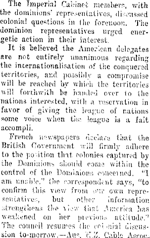 The Imperial Cabinet member!!, with the dominions' representatives, dismissed colonial questions in Ihe forenoon. The dominion representatives urged energetic action in their interest. It is believed the Amer'.ean delegates are not entirely unanimous regarding the incernationalisation of the conquered territories, ar.d possibly a compromise will be readied by which the territories will forthwith be handed over to the nations interested, with a reservation in favor of giving the league of nations some voice when the league is a fait accompli. French nev/spapera deciara that the British Government -,viil firmly adhere i to the position tint colonies captured by the Dominions, should corns within the control of the Dominion:-, concerned. "I am unable,'' the correspondcriit says, "to confirm this view from our own representative:-, but other information strengthens the ilr.v that America has weakened on her pievioiin attitude.' 1 The council resiures (he coi .«jsl discussion to-morrow.—Au°-. '€.','. Cable Assoc