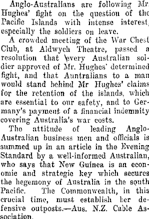 I Anglo-Australians are following Mr. [ Hughes' fight on the question of the I Pacific Islands with intense interest, especially the soldiers on leave. A crowded meeting of the War Chest Club, at Aldwych Theatre, passed a resolution that \pvcry Australian soldier approved of Mr. Hughes' determined fight, and that Auntralians to a man would stand behind Mr Hughes' claims for the retention of the islands, which are essential to our safety, and to Germany's payment of a financial indemnity covering Australia's war costs. The attitude of leading AngloAustralian business men and officials is snmmed up in an article in the Evening Standard by a well-informed Australian, who says that New Guinea is an economic and strategic key which secures the hegemony of Australia in the south Pacific. The Commonwealth, in this crucial time, must establish her defensive outposts.—Aus. N.Z. Cable Association.