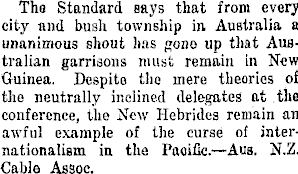The Standard says that from every city and bush township in Australia a unanimous shout has gone up that Australian garrisons must remain in New Guinea. Despite the mere theories of the neutrally inclined delegates at the conference, the New Hebrides remain an awful example of the curse of internationalism in the Pacific.—Aus. N.Z. Cable Assoc.