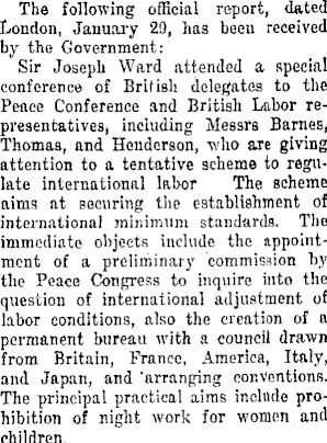The following official report, dated London, January 29, has been received by the Government: Sir Joseph Ward attended a special conference of British delegates to the Peace Conference and British Labor representatives! including Messrs Barnes, Thomas, and Henderson, who are giving attention to a tentative scheme to regulate international kbor The scheme aims at securing the establishment of international minimum standards. The immediate- objects include the appointment of a preliminary commission by the Peace Congress to inquire into the question of international adjustment of labor conditions, also the creation of a permanent bureau with a council drawn from Britain, Franco, America, Italy, and Japan, and 'arranging conventions. The principal practical aims inolude prohibition of night work for women and children.