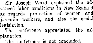 Sir Joseph Ward explained the advanced labor conditions in New Zealand as regards protection of women and juvenile workers, and also the social legislation. The' conference appreciated the explanation. The conference ia not concluded.