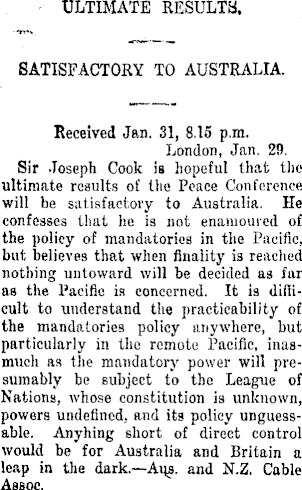 - ULTIMATE RESULTS. SATISFACTORY TO AUSTRALIA. Received Jan. 31, 8.15 p.m. London, Jan. 29. Sir Joseph Cook is hopeful that the ultimate results of the Peace Conference will he satisfactory to Australia. He confesses that he is not enamoured of the policy of mandatories in the Pacific, but believes that when finality is reached nothing untoward will be decided as far as the Pacific is concerned. It is difficult to understand the practicability of the mandatories policy anywhere, but particularly in the remote Pacific, inasmuch as the mandatory power will presumably be subject to the League of Nations, whose constitution is unknown, powers undefined, and its policy unguessablc. Anyhing short of direct control would be for Australia and Britain a leap in the dark.-—Aus. and N.Z. Cable Assoc.