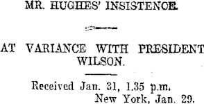 MR. HUGHES' INSISTENCE. AT VARIANCE WITH PRESIDENT WILSON. Received Jan. 31, 1.35 p.m. New York, Jan. 2D.