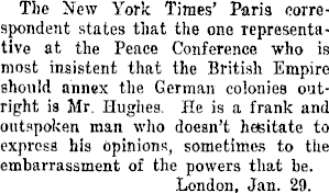 The New York Times' Paris correspondent states that the one representative at the Peace Conference who is most insistent that the British Empire should annex the German colonies outright is Mr. Hughes. He is a frank and outspoken man who doesn't hesitate to express his opinions, sometimes to the embarrassment of the powers that be. London, Jan. 29.
