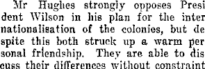 Mr Hughes strongly opposes President Wilson in his plan for the internationalisation of the colonies, but despite this both struck up a warm personal friendship. They are able to discuss their differences without constraint.