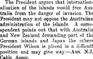 The President argues that internationalisation of the islands would free Aus. tralia from the danger of invasion. The President may not oppose the Australian administration of the islands. A correspondent points out that with Australia and New Zealand demanding part of the German islands and Japan the others President Wilson is placed in a difficult position and may give way.—Aun. N.Z. Cable Assoc.