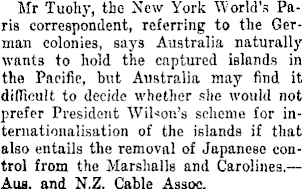 Mr Tuohy, the New York World's Paris correspondent, referring to the German colonies, says Australia naturally wants to hold the captured islands in the Pacific, but Australia may find it difficult to decide whether she would not prefer President Wilson's scheme for intemationalisation of the islands if that also entails the removal of Japanese control from the Marshalls and Carolines.— Aus. and N.Z. Cable Assoc.