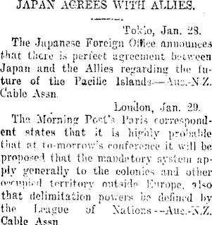 JAPAN AGREES WITH ALLIES. Tokio, Jan. 28. The Japanese Foreign Office announce* that there i.s perfect agreement between Japan and the Allies regarding the future of the Pacific Islands—Aus.-NZ. Cable Assn Loudon, Jan. 29. Ths Morning Pel's Paris correspondent states that it is highly provable that at tn-morruv/'s conference it will be. proposed that the mandatory system apply generally to the colonies and other o'K-upN-d territory nutsidp Ivirope, ?ho that delimitation powers be defined by the League of Nations--Aus.-N.Z. Cable Assn.