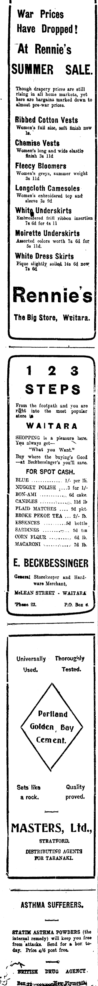 War Prices Have Dropped! At Rennie's SUMMER SALE. Though drapery prices are still rising is all home markets, yet here are bargains marked down to almost pre-war prices. Ribbed Cotton Vests Women's full size, soft finish now I».' Chemise Vests Women's long and wide elastic finish 3s lid Fleecy Bloomers Women's greys, summer weight 3s lid Longcloth Camesoles Women's enbroidered top and sleeve 3s 9d White. Underskirts id frill ribbon insertion 7s fid for 4s 11 Moirette Underskirts Assorted colors worth 7s 6d for 5s lid. White Dress Skirts Pique slightly soiled 14s 6d now 7a 6d Rennie's The Big Store, Weitara. STEPS From the footpath and you are right into the most popular •tore i* WAITARA SHOPPING U a pleasure here. You always get— "^ "What you Want." Bny where the Good —at Beckbessinger's you'll sa?e. FOR SPOT CASH. BLUE l/. per lb. NUGGET POLISH ....3 for 1/-BQN-AMI ~ 6d cake. CANDLES - c .. lid lb PLATO MATCHES .... 9d pktBROKE PEKOE TEA ... 2/- lb. ESSENCES 5d bottle SARDINES r?..., Od tin' CORN FLQUR ed lb. MACARONI • • Td lb. E. BECKBESSINGER General Storekeeper and Hardware Merchant, MeLEAN STREET - WAITARA Universally Thoroughly / Portland \ Golden Bay V Cement. / Sets like a rock. MASTERS, Ltd., STBATFOBJX DISTRIBUTING AGENT 3 TOR TARANAKL ASTHMA SUFFERERS. STATUS ASTHMA POWDERS (the internal remedy) will keep you free from'attacks. Send for a box today. Price. 4/6 post free. . BRITISH DOTC AGENCY-