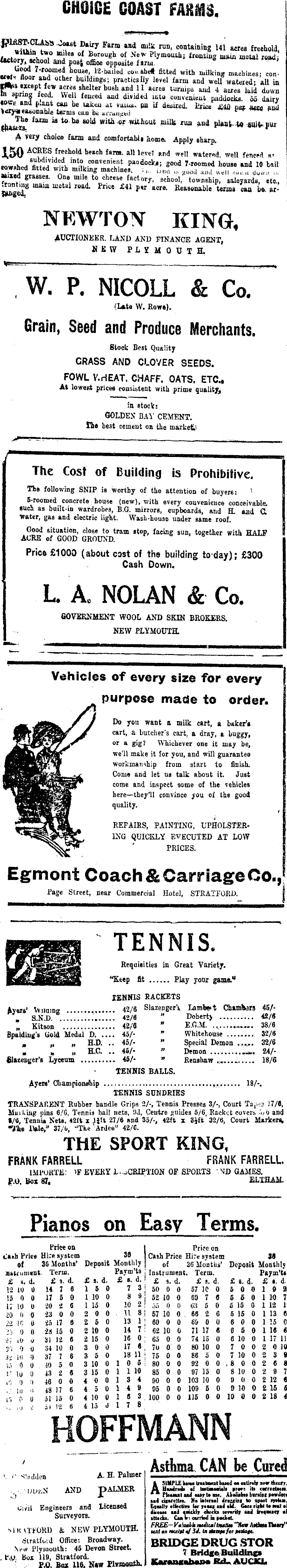 CHOICE COAST FAKMB. Dtir y Farin »nd run, containing 141 acres freehold, f„* 1, 1° of Borou S h of NeW Plymouth; fronting main metal road; fMtory, school and post office opposite farm. ° ' «-.# G fl°'!., 7 " ro ? Ul ?? hc " ae > cowshed fitted with milking machines; con- «•»< floor and other buildings; practically level farm and well watered; all in sautta 1 * ts faua is to-be sold with or witiumt milk rua and plant--t» suit* jrnx A very choice fann and comfortable home. Apply sharp. 1,50 AC f ES freehold beßch fa ™»- an leveT and well watered, well fenced a» eowßhod '"to convenient; paodoclu; good 7-roomed house and 10 bail cowshed fitted with milking machines. 1; ,„ u , a xoo(1 uiul we „ ~u , „ d f ,Se ° B raasea - One mile to cheese factory, school, township, aaJevards, etc., •ton mg wain metal road. Price £4l p« acre. Reasonable terms can be. arHinged, NEWTON KING, AUCTIONEER. LAND AND FINANCE AGENT, MfiW PLYMOUTH. W. P. NICOLL & Co. (Late W. Sows). Grain, Seed and Produce Merchants. Stock Best Quality CRASS AND CLOVER SEEDS. FOWL V.HEAT, CHAFF. OATS. ETC.. At lowest prices consistent with prime quality in stock: GOLDEX BAY CEMENT. n« best cement on the market* The Cost of Building is Prohibitive. The following SNIP is worthy of the attention of buyers: ! 5-roomed concrete house (new), with every convenience conceivable, such as built-in wardrobes, B.G. mirrors, cupboards, and H. and G Water, gas and electric light. Wash-house under same roof. Good situation, close to tram stop, facing sun, together with TTAT.I? ACRE of GOOD GROUND. Price £IOOO (about cost of the building to day); £3OO Cash Down. L. A c NOLAN & Co. GOVERNMENT WOOL AND SKIN BROKERS. NEW PLYMOUTH. Vehicles of every size for every purpose made to order. Do you want a milk cart, a baker's cart, a butcher's cart, a dray, a buggy, or a gig! Whichever one it may be, we'll make it for you, and will guarantee workmanship from start to finish. Come and let us talk about it. Just come and inspect some of the vehicles here—they'll convince you of the good quality. REFAIRS, PAINTING, UPHOLSTERING QUICKLY EVECUTED AT LOW PRICES. Egmont Coach & Carriage Co.,| Page Street, near Commercial Hotel, STRATFORD. TENNIS. Requisites in Great Variety. "Keep fit Play yotir game." Lambett ChamVars 45/Doberty 42/6 E.G.M. ... 38/6 Whitehouse ........ 32/6 Special Demon ..... 32/6 Demon 24/Renghaw 18/6 lENNIS RACKETS dyers' Vviming 42/8 Slazenger's » S.NJ) 42/6 ~ Kitson 42/6 Bpaidiug's Gold Medal D 45/- „ „ „ H.D. .. 45/- „ „ H.C. .. 45/filazenger's Lyceum 46/TENNIS BALLS. Ayen' Championship 18/-. TENNIS SUNDRIES TRANSPARENT Rubber handle Grips 2/-, Tennis Presses 3/-, Court Tapa 17/8, Marking pins 6/6, Tennis ball nets, 1!J, Centre guides 5/6, Racket covers •">/(> and »/6, Tennia Nets, 42ft x ijft 27/6 and 35/-, 42ft x BJft 32/6, Court Markers, ">'he Hale," 37/b, -'The "Ardee" 42/6. THE SPORT KING, FRANK FARRELL FRANK FARRELL. IMPUUTJi: IF EVERY L.oCRIPTION OF SPORTS N'D GAMES. P.O. Box 87, ELTHAM. Pianos on Easv Terms. Price on bath Pries Hire system 30 1 Price on I Cash Price Hire system U Monthly Paym'U £ s. d. i e a 1 10 7 1 12 1 1 13 6 1 15 C 1 16 « 1 17 11 2 0 10 3 3 9 2 6 8 2 9 7 2 12 6 2 15 S 2 18 4 HOFFMANN i. siiulden A. H. Palmer . AND pALMER Uwil Engineers and Licensed Surveyors. MKVTFORD & NEW PLYMOUTH, •itrfttfovd Office: Broadway. Sh»v Plymouth: 45 Devon Street. . f.o box 119, Stratford. , P.O. Box 116. Naw Plymouth. Asthma, CAN be Cured A SIMPLE I*im lmtautbu«4 «• «tiwtf »m» &««rr. HiaMb $f »T*r« ill carrecfaKta. Ptauut Mir to mm. AWiakts bwnipr »«wfai iui dgarettet. btere»! dritfUf lo tttfdtft Equity eUectir* Ur yiui uJ «U. Gwi riiki to mt •) 4«*m« ui wield? «fc<b wwitf a*d ir«f«Kr «J ftttack*. Cm Vi carried a Mck<L FREE-VtlruihmAoHmrn "M« A«ttailW unt tit Haiti rf 3J. In ri»n ft far *ula&. BRIDGE DRUG STOR 7 Bridget Buildings KawuMMbuM Kd-AUCICL