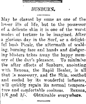 SUNBURN, May be classed by some as one of the les-er ills of life, but to the possessor of a delicate skin it is one of the worst modes of torture to be imagined. After a glorious day in the Surf, or a delightful bush Picnic, the aftermath of scalding, burning face and hands and disfiguring blisters takes away the happy memory of the day's pleasure. To minimise the after effects of Sunburn, anointing with Rexona, the Rapid Healer, is all that is necessary, and the Skin, soothed and cooled by its wonderful influence, will quickly regain its normal temperature and comfortable coolness. Rexona, 1/6 _and 3/-.' Obtainable everywhere.
