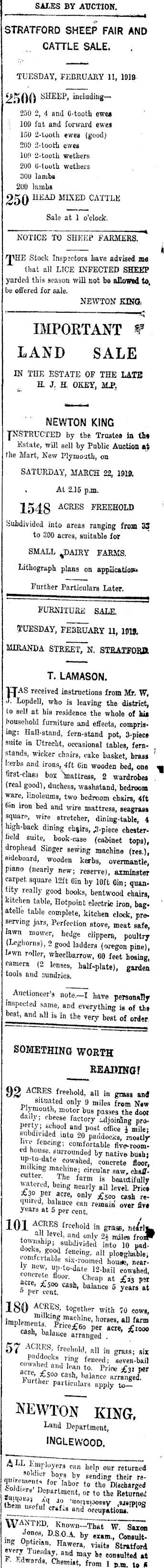 SAI.ES by auction. STRATFORD SHEEP FAIR AND _ CATTLE SALE. TUESDAY, FEBRUARY 11, 1919 including—--250 2, 4 and fi-tootli owes 100 fat and forward ewes 150 2-tooth ewes (good) 200 2-tooth ewes 100 2-tootli wetliers 200 0-tooth wethers SOU lambs 200 lambs 25Q HEAD MIXED CATTLE Sale at 1 o'clock. NOTICE TO SHEEP FARMERS. Stock Inep actors liave advised ma that all LICE INFECTED RTmCT yarded this season will not be allotted to, be offered for sale. NEWTON KINO, IMPORTANT *? LAND SALE IN THE ESTATE OF THE LATE t H. J. H. OKEY, 3LP. NEWTON KING JNSTRUCTED by the Trustee in €h« Estate, will sell by Public Auction at the Mart, New Plymouth, on SATURDAY, MARCH 22, 1919. , At 2.15 pan. 1548 ACRES FREEHOLD Subdivided into areas ranging from 33 to 300 acres, suitable for SMALL % DAIRY FARMS. Lithograph plans on application Further Particulars Later. FURNITURE HAT.m TUESDAY, FE3RUARY U, 1010. MIRANDA STREET, N. STBAIFOBft T. LAMASON. "CTAS received instructions from Mr. W, J. Lopdell, who is leaving the district, to sell at his residence the whole of bis household furniture and effects, comprising: Hall-stand, fern-stand pot, 3-piece suite in Utrecht, occasional tables, fernstands, wicker chairs, cake basket, brass leibs and irons, 4ft Gin wooden bed, one first-class box \mttress, 2 wardrobes (real good), duchess, washstand, bedroom ware, linoleums, two bedroom chairs, 4ft 6in iron bed and wire mattress, seagraaa square, wire stretcher, dining-table, 4 high-back dining chjirs, Apiece cheaterheld suite, book-case (cabinet tops), drophcad Singer sewing machine (res.), sideboard, wooden kerbs, overmantle, piano (nearly new; reserve), axminster carpet square 12ft 6in by 10ft Cin; quantity really good books, bentwood chairs, kitchen table, Hotpoint electric iron, bagatelle table complete, kitchen clock, preserving jars, Perfection stove, meat safe, lawn mower, hedge clippers, poultry (Leghorns), 2 good ladders (Oregon pine), fcwn roller, wheelbarrow, CO feet hosing, camera (2 lenses, half-plate), garden tools and sundries. Auctioneer's note.—l have personally inspected same, and everything is of the best, and all is j n the very best of order. SOMETHING WORTH READING? 02 ACRES freehold, all in grass and situated only 9 miles from New J' iymouth, motor bus passes the dooi daily; cheese factory wljoinSng property; school and post office J mile; subdivided into 20 paddocks, mostly t encing; comfortable five-room-ed house surrounded by native bush; nlk-inJ ?° W3lled > co »"ete floor, J? " m^i une ; circular saw, chaffuH i 1 farm is beautifully v- ' beir, g nearly all leveL Price ,mir°,i PPer i r , a ° re ' oDly *SOO cash rew can rMQuin > over flv« years at j per cent, 101 A^. R 1 ES freehold in grass, nfi/rlw tmv.f i • ' ! , md on! . v 2 i males froj* dooU , Sukdivided into 10 padoomfr'J n lenehl " «>' plooghable; lv new slx -*oo'-ned houtß, nearran 1 ' ate 12-bail cashed, concrete floor. Cheap at £i 3 p» 5 bftlaace 5 years at 180 A ® ES ' together with 70 cows, imi)lem "!' kl l g waehine, horses, all farm Zh L " Ce£6o per acre > £"«» cash, balance arranged . 5 ( tree ' lo '<'i all in grass; six = ks ''i"g fenced; seven-bail cowshed and lea,, to . Prioe £)1 ifn Vt 0 c ' balance arranged, further particulars apply toNEWTON KING, Land Department, inglewood. A LL Employers can help our returned n„J, ; a , bo '™ by sending their recj j. el , ' or lal) or to the Discharged soldiers Department, or to the Returned WAN TED, Known—That W. Saron Jones, D.S.O.A. by exam., Consult,tgm! ' t 7 Hawera, visits Stratford very Tuesday, and may be consulted at F-Edwords, Chemist, from 1 p.m. to *