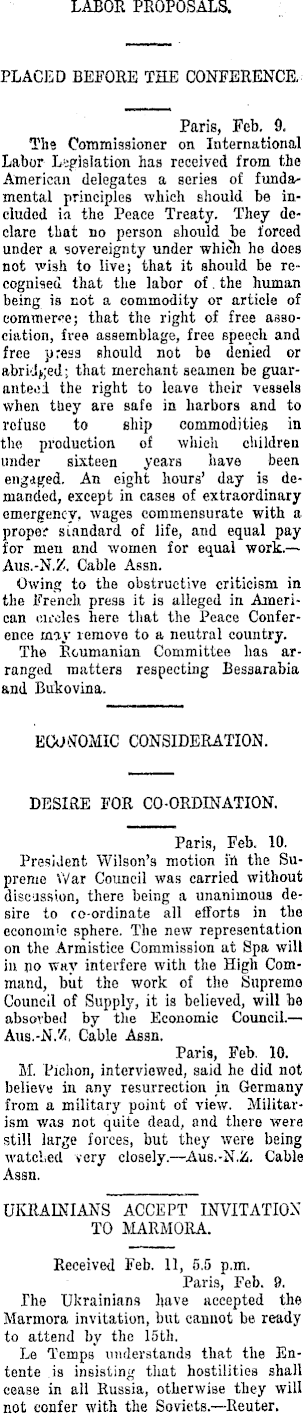 LABOR PROPOSALS. PLACED BEFORE THE CONFERENCE. Paris, Feb. 9. The Commissioner on International Labor Legislation has received from the American delegates a series of fundamental principles which should be included in the Peace Treaty. They declare that no person should be forced under a sovereignty under which he does not wish to live; that it should be recognised that the labor of. the human being is not a commodity or article of commerce; that the right of free association, free assemblage, free speech and free press should not be denied or abridged; that merchant seamen be guaranteed the right to leave their vessels when tiiey are safe in harbors and to refuse to ship commodities in the production of which children under sixteen years have been engaged. An eight hours' day is demanded, except in cases of extraordinary emergency, wages commensurate with a proper standard, of life, and equal pay for men and women for equal work.— Aus.-N.Z. Cable Assn. Owing to the obstructive criticism in the French press it is alleged in American cu'cles here that the Peace Conference may remove to a neutral country. The Roumanian Committee has arranged matters respecting Bessarabia and Bukovina. ECONOMIC CONSIDERATION. DESIRE FOR CO-ORDINATION. Paris, Feb. 10. President Wilson's motion in the Supreme War Council was carried without discussion, there being a unanimous desire to co-ordinate all efforts in the economic sphere. The new representation on the Armistice Commission at Spa will in no way interfere with the High Command, but the work of the Supremo Council of Supply, it is believed, will he absorbed by the Economic Council.— Aus.-N.Z, Cable Assn. Paris, Feb. 10. M. Pichon, interviewed, said he did not believe in any resurrection in Germany from a military point of view. Militarism was not quite dead, and there were still forces, but they were being watcbed very closely.—Aus.-N.iS. Cable Assn. UKRAINIANS ACCEPT INVITATION | TO MARMORA. Received Feb. 11, 5.5 p.m. Paris, Feb. 9. The Ukrainians have accepted the Marmora invitation, but cannot be ready to attend by the 15th. Le Temps understands that the Entente is insisting that hostilities shall cease in all Russia, otherwise they will not confer with the Soviets. —Reuter.