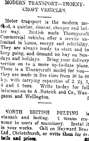 MODERN TRANSPORT— THORNYC.ROJT VEHICLES. Motor transport is the modern method, a quicker, cleaner, cheaper and Letter way. British made Thornycroft Commercial vehicles offer a service unlimited in hours, energy and reliability They are always ready to start and to keep going, and demand no liav on Sundays and holidays. Bring your delivery service on to a more up-to-date plane There is a Thornycroft model for vou—they are made in five sizes from lio'to 40 h ;>. with carrying capacities of 2 2} 3 4 and fi tons. Write to-day for "full information to A .Katrick andCo, Wanganui and Wellington. 2 N'ORTH BRITISH BELTING is staunch and lasting. t means economy to users of machinery. Instal it in your works. Call on Hayward Bro* Ltd., Christehurch, or write tiem for dttsils a>d priceg, a
