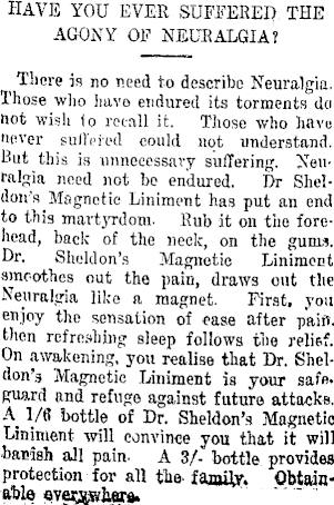 HAVE YOU EVER SUFFERED THE AGONY OF NEURALGIA? There is no need to describe Neuralgia. Those who have endured its torments da not wish io recall it. Those who have never suffered could not understand. But this is unnecessary suffering. Neuralgia need not be endured. Dr Sheldon's Magnetic Liniment has put an end to this martyrdom. Rub it on the fore- - 0 f .(.kg nec ] C( on j.] le gumseldon's Magnetic Liniment smoothes out the pain, draws out the Neuralgia like a magnet. First, you enjoy the sensation of ease after p'aifv. then refreshing sleep follows the relief. On awakening, you realise that Dr. Sheldon's Magnetic Liniment is your safeguard and refuge against future attacks. A 1/8 bottle of Dr. Sheldon's Magnetic Liniment will convince you that it will ■banish all pain. A 3/- bottle provides protection for all the- fairly, Obtain"