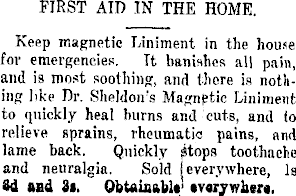 FIRST AID IN THE HOME. Keep magnetic Liniment in the house for emergencies. It banishes all pain, and is most soothing, and there is nothing like Dr. Sheldon's Magnetic Liniment to quickly heal burns and cuts, and (o relieve sprains, rheumatic pains, and lame back. Quickly gtops toothache and neuralgia. Sold everywhere, Is 1 3d ABd Si. Obtauftblr •vwvwken.