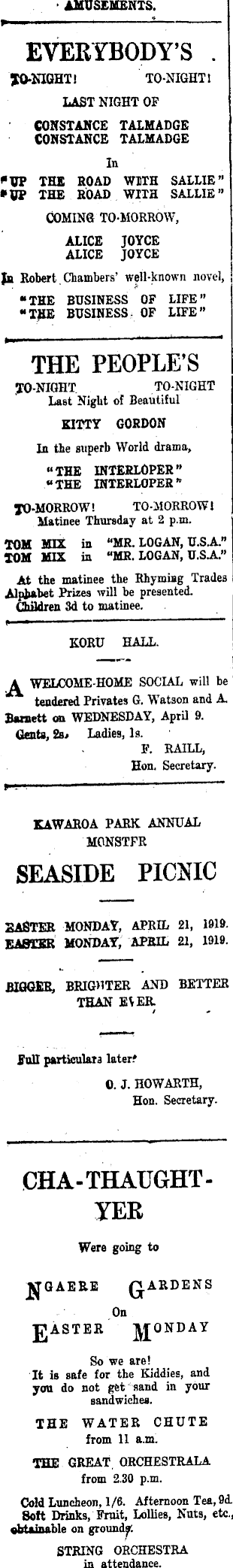 AMUSEMENTS. EVERYBODY'S . JO-NIGHT! TO-NIGHT I LAST NIGHT OF CONSTANCE TALMADGE CONSTANCE TALMADGE la *UP THE BOAD WITH SALLIE" *O7 THE BOAD WITH SALLIE" COMING TO-MORROW, ALICE JOYCE ALICE JOYCE Jd Robert Chambers' well-known novel, "THE BUSINESS OF LIFE" "TJIB BUSINESS- OF LIFE" THE PEOPLE'S TO-NIGHT. TO-NIGHT Last NigUt of Beautiful KITTY GORDON In the superb World drama, "THE INTERLOPER" « THE INTERLOPER * JO-MORROW! TO-MORROW i Matinee Thursday at 2 p.m. TOM MIX in "MR. LOGAN, U.S.A." XOM in "MR. LOGAN, U.S.A." At the matinee the Rhyming Trades Alphabet Prizes will be presented. Children 3d to matinee. KORU HALL. A WELCOME-HOME SOCIAL will be tendered Privates G. Watson and A. Bunett on WEDNESDAY, April 9. dents, 2a» Ladies, Is. F. RAILL, Hon. Secretary. KAWAROA PARK ANNUAL MONSTFR SEASIDE PICNIC 2ABTER MONDAY, APRIL 21, 1919. EASIER MONDAY, APRIL 21, 1919. pfOOBBj BRIGHTER AND BETTER THAN EVER. fall particulars later.' 0. J. HOWARTH, Hon. Secretary. CHA-THAUGHT-YER Were going to IJGAEB.E Q.ARDENS On JJASTER JJONDAY So we are! It is safe for the Kiddies, and you do not get sand in your sandwiches. THE WATER CHUTE from II a.m. THE GREAT ORCHESTRALA from 2.30 p.m. Cold Luncheon, 1/6. Afternoon Tea, 9i Soft Drinks, Fruit, Lollies, Nuts, etc., obtainable on ground^. STRING ORCHESTRA in attendance.