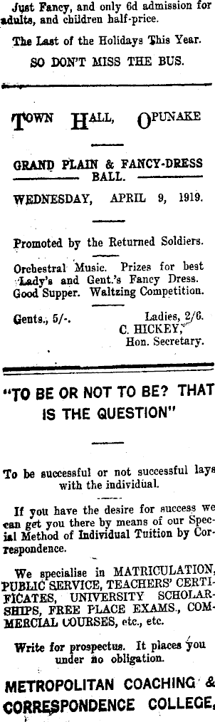 Jipt Fancy, and only 6d admission for adults, and children half-price. The Last of the Holidays "Shis Year. SO DON'T MISS THE BUS. IJIOWN JJALL, QPUNAKE GRAND PLAIN & FANCY-DRESS — BALL. WEDNESDAY, APRIL 9, 1919. Promoted by the Returned Soldiers. Orchestral Music. Prizes for beat 'Lady's and Gent's Fancy Dress. Good Supper. Waltzing Competition. Gents., 5/-. Ladies, 2/6. C. HICKEY, Hon. Secretary. "TO BE OR NOT TO BE? THAT IS THE QUESTION" To be successful or not successful lays with the individual. If you have the desire for success we can get you there by means of our Special Method of Individual Tuition by Correspondence. We specialise in MATRICULATION, PUBLIC SERVICE, TEACHERS' CERTIFICATES, UNIVERSITY SCHOLARSHIPS, FREE PLACE EXAMS., COMMERCIAL COURSES, etc., etc. Write for prospectus. It places under no obligation. METROPOLITAN COACHING & CORRESPONDENCE COLLEGE,