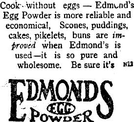 Cook - without eggs Edmund's Egg Powder is more reliable and economical, Scones, puddings, cakes, pikelets, buns are improved when Edmond's is used—it is so pure and wholesome. Be sure it's