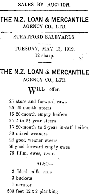 SALES BY AUCTION. THE N.Z. LOAN & MERCANTILE AGENCY CO., LTD. STRATFORD SALEYARDS. TUESDAY, MAY 13, 1919. 12 sharp. . lj THE N.Z. LOAN & MERCANTILE AGENCY CO., LTD. 25 atore and forward cows 20 20-month steers 15 20-month empty heifers 25 2 to 2 J-year steers 15 20-month to 2-year in-calf heifers 30 mixed weaners 22 good weaner steers 50 good forward empty ewes 75 f.f.m. ewes, r.w.r. ALSO--3 Ideal milk cans 3 buckets 1 aerator 500 feet 12x2 planking