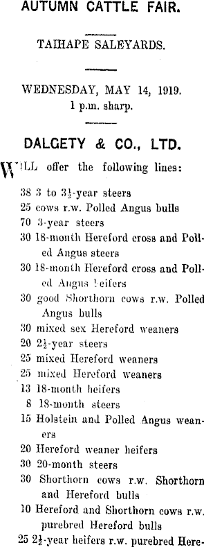 AUTUMN CATTLE FAIR. TAIHAPE SALEYARDS. WEDNESDAY, MAY 14, 1919. 1 p.m. sharp. DALCETY & CO., LTD. H'ILL offer the following lines: 38 3 to 3.J-year steers 25 cows r.w. Polled Angus bulls 70 3-year steers 30 18-montli Hereford cross and Polled Angus steers 30 18-month Hereford cross and Polled Angus Veifers 30 good Shorthorn cows r.w. Polled Angus bulls 30 mixed sex Hereford weaners 20 2J-year steers 25 mixed Hereford weaners 25 mixed Hereford weaners 13 18-month heifers 8 18-moiith steers 15 Holstein and Polled Angus weaners 20 Hereford weaner heifers 30 20-month steers 30 Shorthorn cows r.w. Shorthorn and Hereford bulls 10 Hereford and Shorthorn cows r.w. purebred Hereford bulls 25 2}-year heifers r.w. purebred Here-