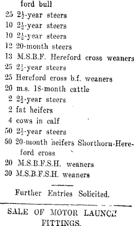 ford bull 25 2|-year steers 10 2s-year steers 10 2J-yoar steers 12 20-month steers 13 M.S.B.F. Hereford cross weaners 25 21-year steers :ercford cross b.f. weaners 20 m.s. IS-montli cattle 2 2J-year steers 2 fat heifers 4 cows in calf 50 2i-year steers 50 20-month heifers Shorthorn-Here-ford cross 20 M.S.B.F.S.H. weaners 30 M.S.B.F.S.H. weaners Further Entries Solicited. SALE OF MOTOR LAUNCH FITTINGS.