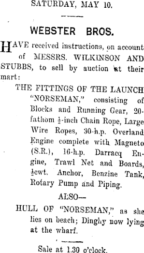 SATURDAY, MAY 10. WEBSTER BROS. J AVE received instructions, on account of MESSRS. WILKINSON AND STUBBS, to Bell by auction kt their mart: THE FITTINGS OP THE LAUNCH "NORSEMAN," consisting of Blocks and Running Gear, 20fathom 3-inch Chain Rope, Large Wire Ropes, 30-h.p. Overland Engine complete with. Magneto (S.R.), 10-h.p. Darracq Engine, Trawl Net and Boards, Jcwt. Anchor, Benzine Tank, Rotary Pump and Piping. ALSO—HULL OP "NORSEMAN," as she lies on beach; Dinghy now lying at the wharf. Sale at 1.30 o'clock.