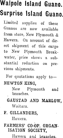 Walpole Island Guano. Surprise Island Guano. Limited supplies of these Guanos are now available from store, New Plymouth & Hawera. On account of direct shipment of this cargo to New Plymouth Breakwater, price shows a substantial reduction on previous shipments. For quotations apply to— NEWTON KING, New Plymouth and branches. GAUSTAD AND MARLOW, VVaitara. F. GIUANDERS, Hawera. FARMERS' CO-OP. ORGANISATION SOCIETY, Hawera and branches.