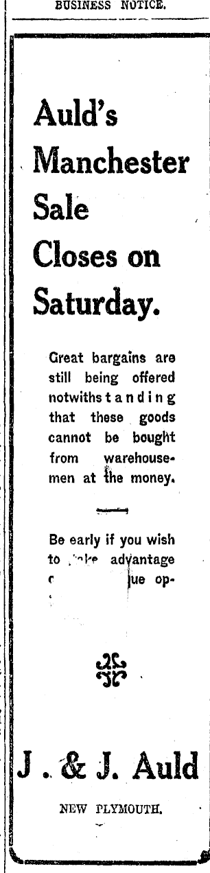 BUSINESS NOTICE. Auld's Manchester Sale Closes on Saturday. Great bargains are still being offered notwiths t a n d i n g that these goods cannot be bought from warehousemen at the money. Be early if you wish to J . & J. Auld c jue opNEW PLYMOUTH.