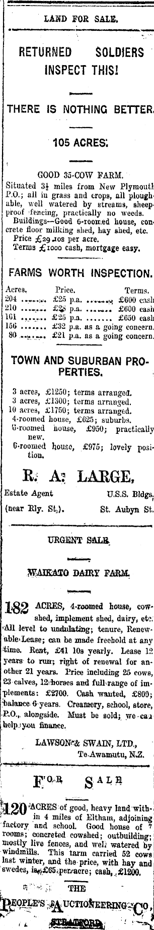 LAND FOR SALS. RETURNED SOLDIERS INSPECT THIS! THERE IS NOTHING BETTER. 105 acres: GOOD 35-COW FARM. Situated 3£ miles from New Plymouth P. 0.; all in grass and crops, all ploughable, well watered by streams, sheepproof ftoicing, practically no weeds. Buildings—Good 6-iooii.ed house, concrete floor milking shed, hay shed, etc. Price £29 jos per acre. Terms £IOOO cash, mortgage easy. FARMS WORTH INSPECTION. Acres. Price. Terms. 204 £25 p.a. £OOO cash 210 p.a. ...£6OO cash 101 ........ £25 p.a £650 cash 156 £32 p.a. as a going concern. 80 £2l p.a. as a going concern. TOWN AND SUBURBAN PROPERTIES. 3 acres, £1250; terms arranged. 3 acres, £1300; terms arranged. 10 acres, £17(30; terms arranged. 4-roomed house, £025; suburbs. U-roomed house, £950; practically new. G-roomed house, £975; lovely position. K. A? LARGE, Estate Agent U.S.S. Bldgs. (near Ely. St.). St. Aubyn St. URGENT SALS. WJMBMO DAIRY FARM. m ACRES, 4-roomed house, cow* shed, implement shed, dairy, etc. 'All level to undulating; tenure, Renewable Lease; can be made freehold at any ■time. Rent, £4l 10s yearly. Lease 12 years to ruir; right of renewal for another 21 years. Price including 25 cows, 23 calves, 12'iiorses and full-range of implements: £2700. Cash wanted, £800; talance O years. Creamery, school, store, ■R.0.,. alongside. Must be sold; we caj help. 1 you finance. LAWSQN'"& SWAIN, LTD., Te.Awaimitu, N«Z. gA L H ot good, heavy landwithin 4 miles of liltham, adjoining factory and school Good house of 7 rooms; concreted cowshed; outbuilding; moatly lire fences, and weli watered by windmills. This tarm carried 52 cows last winter, and the-price, with hay and swedes, ia*f£Bs,pemtcre; cash,£l2oo. ( "i:' THE