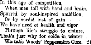 In this age of competition, When men toil with hand and brain, Spurred by soul-inspired ambition, Or by sordid lust of gain We have need of health and vigor Through life's struggle to endure, That's just why for colds in waiter _ We< take Woods' Eegpanrattfc Ooze. 21