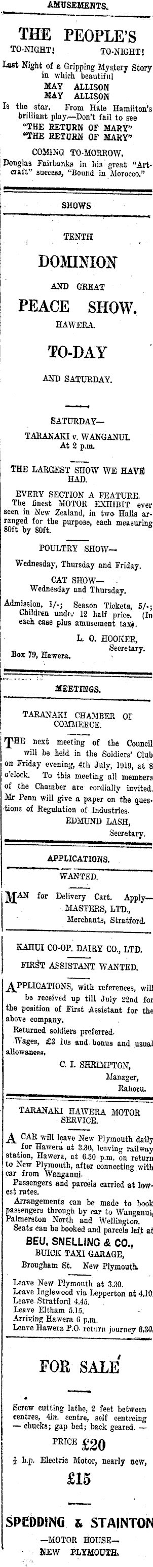 AMUSEMENTSTHE PEOPLE'S TO-NIGHT J TO-NIGHT! last Night of a Gripping Mys,tery Story in which beautiful MAY ALLISON MAY ALLISON la the star. From Hale Hamilton's brilliant play—Don't fail to see "THE RETURN OF MARY" "THE RETURN OF MARY" COMING TO-MORROW. Douglas Fairbanks in his great "Artcraft" success, "Bound in Morocco." SHOWS , TENTH DOMINION AND GREAT PEACE SHOW. hawera. TO-DAY AND SATURDAY. SATURDAY—TARANAKI v. WANGANUL At 2 p.m. THE LARGEST SHOW WE HAVE HAD. EVERY SECTION A FEATURE. The finest MOTOR EXHIBIT evev seen in New Zealand, in two Halls arranged for the purpose, each measuring 80ft by 80ft. 6 POULTRY SHOW— Wednesday, Thursday and Friday. CAT SHOW— . Wednesday and Thursday. Admission, l/. ; Season Tickets, 5/-; Children undc*' 12 half price. (In each case plus amusement tax#. L. 0. HOOKER, _ „ Secretary. Box 79, Hawera, * MEETINGS. TARANAKI CHAMBER Or COMMERCE. <pHE next meeting of the Council will be held in the Soldiers' Club on Friday evening l , 4th July, 1919, at B o clock. To this meeting all members of the Chamber are cordially invited. Mr Penn will give a paper on the ques■tions of Regulation of Industries. EDMUND LASH, Secretary. APPLICATIONS. WANTED. MA* for Delivery Cart. Apply— MASTERS, LTD., Merchants, Stratford. KAHUI CO-OP. DAIRY CO., LTD. FIRSfT ASSISTANT WANTED. APPLICATIONS, with references, will be received up till July 22nd for the position of First Assistant for the above company. Returned soldiers preferred. Wages, £3 lus and bonus and usual allowances, C. I. SHRIMPTON, Manager, Ralioiu. TARANAKI HAWERA MOTOR SERVICE. A CAR will leave New Plymouth daily for Hawera at 3.30, leaving railway station, Hawera, at 6.30 p.m. on return to New Plymouth, after connecting with car from Wanganui. Passengers and parcels carried at lowest rates. Arrangements can be made to hook passengers through by ear to Wanganui, Palmers ton North and Wellington. Seats Can be booked and parcels lef.t at BEU, SNELLING & CO., BUICK TAXI GARAGE, Brougham St. New Plymouth. Leave New Plymouth at 3.30. Leave Inglewood via Lepperton at 4.10. Leave Stratford 4.45. Leave Eltham 5.15, Arriving Hawera 8 p.m. Leave Hawera P.O. return journey 8,30, FOR SALE Screw cutting lathe, 2 feet between centres, 4in. centre, self centreing chucks; gap bed; back geared. PRICE £2O i h.p. Electric Motor, nearly new, £ls SPEEDING & STAINTOW -MOTOR HOUSESEW PLYMOUia