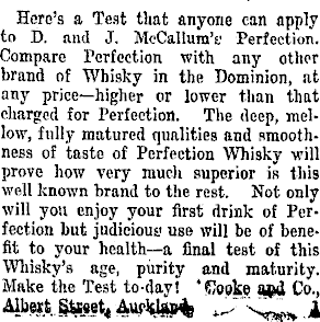 Here's a Test tlmt anyone can apply to D. and J. McCallura's: Perfection. Compare Perfection with any other brand of Whisky in the Dominion, at any price—higher or lower than that charged for Perfection. The deep, mellow, fully matured qualities and smoothness of taste of Perfection Whisky will prove how very much superior is this well known brand to the rest. Not only will you enjoy your first drink of Perfection but judicious; use will be of benefit to your health—a final test of this Whisky's age, purity and maturity. Hake the Test to-day! 'Kopke tupl Co., Albert Staiet« A